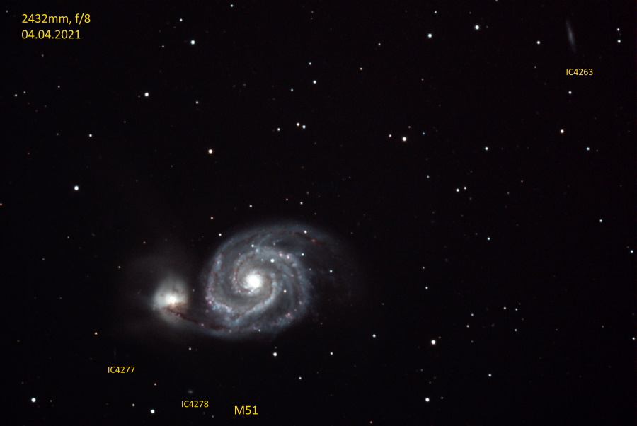 Eines der schönsten Objekte am Frühlingshimmel ist die Galaxie M51, auch bekannt als Strudelgalaxie oder Whirlpool Galaxie. Eigentlich sehen wir hier 2 Galaxien die eine Kollision hinter sich haben. Die kleinere Galaxie hat allerdings auch eine eigene Bezeichnung (NGC 5195) während die große, als "Strudel" sichtbare Galaxie im NGC Katalog die Bezeichnung NGC 5194 besitzt. |