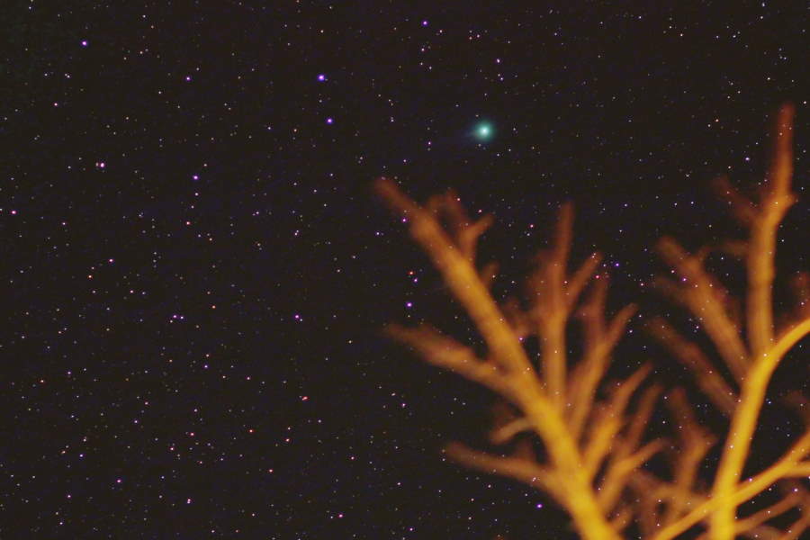 Dieses Foto oben stammt vom 10. Januar 2015 und zeigt, dass Lovejoy bereits sehr hell ist. Am 12. Januar konnte ich den Kometen bereits mit bloßem Auge bei dunklem Himmel wahrnehmen. Er war zwar nur als schwacher verschwommener Stern zu sehen, aber immerhin sichtbar. Daraufhin habe ich mit einem 300mm Objektiv und Nachführung ein paar Bilder gemacht, die ich zusammengefügt / addiert habe, um auch den Schweif sichtbar zu machen (siehe Foto links). ...und hier im Film: Komet Lovejoy in Bewegung (45 Minuten in 41 Sekunden): |