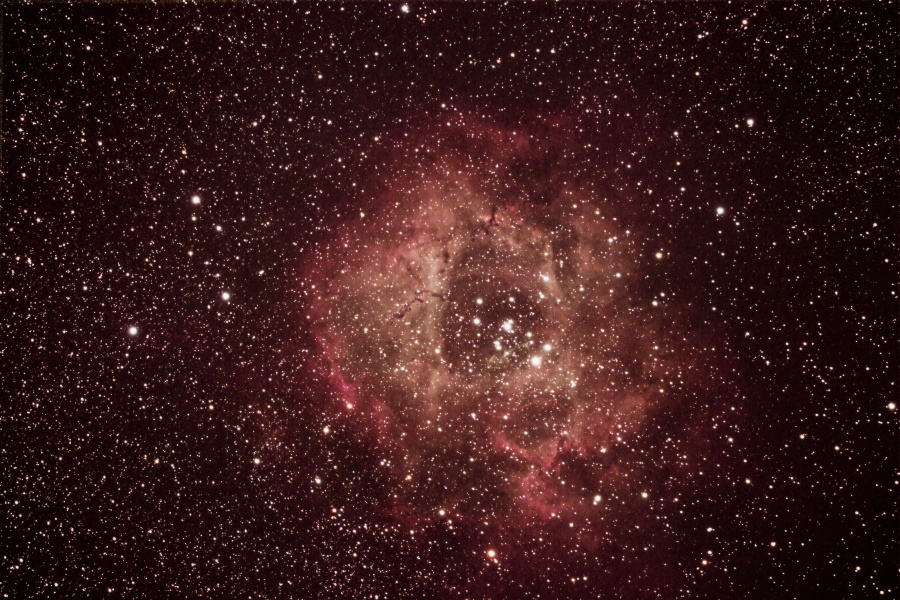 Die Katalognummer von NGC 2237 ist eigentlich nur eine von mehreren, die diesen Nebel beschreiben. Mit NGC2237, NGC2238, NGC2239, NGC2244 und NGC2246 werden verschiedene Phänomene / Objekte dieser Region bezeichnet Fotografisch sticht eindeutig die Rosettenform des rot leuchtenden Gases hervor, das durch die Strahlung der jungen Sterne des im Zentrum befindlichen Sternhaufens zum Leuchten angeregt wird. |