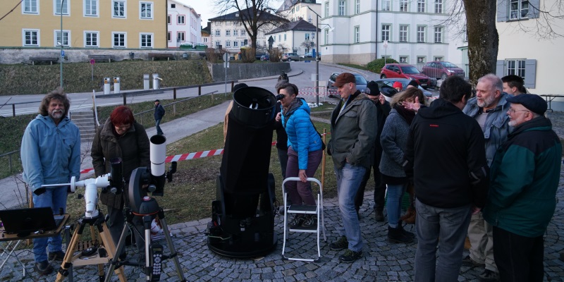 Und als es dann dunkler wurde, selbst bei den lichtverschmutzenden Stadtverhältnissen in Bad Tölz am Schloßplatz, wollte jeder einmal durch ein Teleskop sehen. Es bildeten sich Schlangen vor den Teleskopen, und leider kam vielleicht der eine oder andere mit den Antworten zu seinen Fragen etwas zu kurz, da es richtig "hoch herging" |